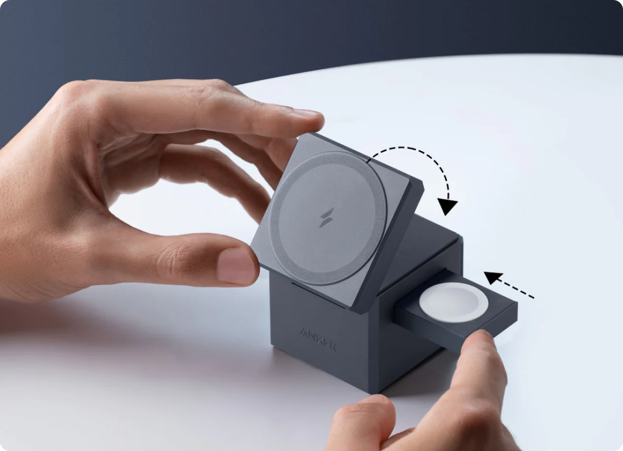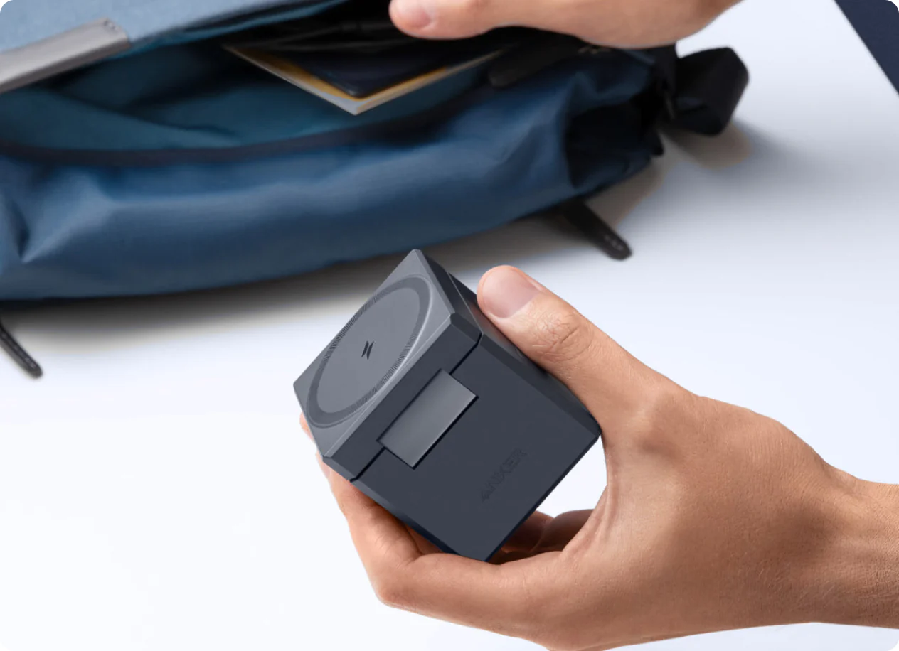Anker 3-in-1 Cube offers compact convenience for on-the-go charging. Exceptionally portable, it transitions from a folded MagSafe charger for your iPhone, Apple Watch, and AirPods, to a tiny cube that effortlessly fits in your bag when unfolded.