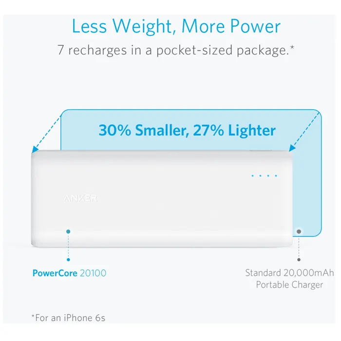 Ultra-High Capacity Weighs as little as a can of soup (12.5 oz) yet charges the iPhone 7 almost seven times, the Galaxy S6 five times or the iPad mini 4 twice.