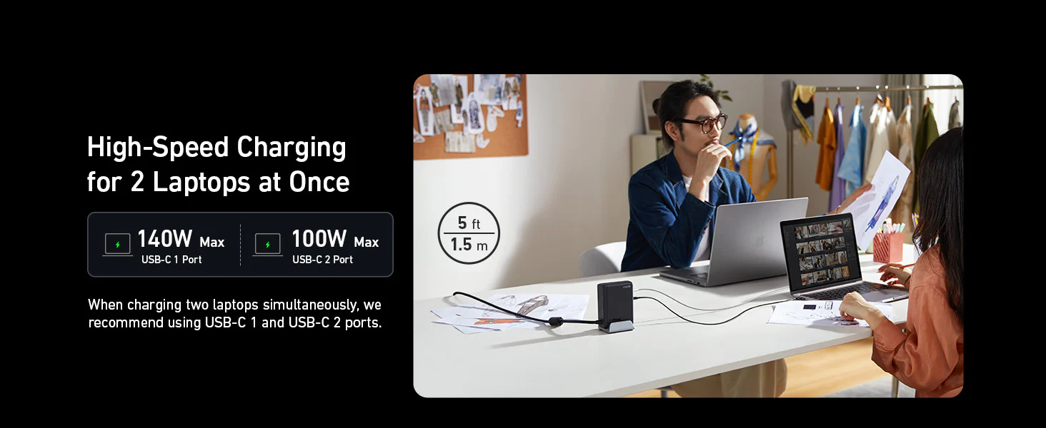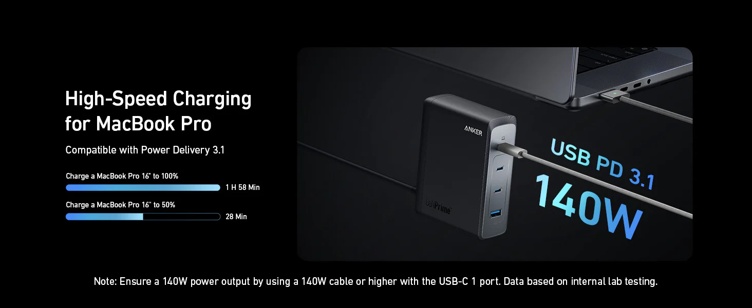 Power two laptops simultaneously with a rapid output of 140W for one laptop and 100W for the other, both compatible with Power Delivery 3.1. Charge a MacBook Pro 16" (M2 Pro) to 50% in just 28 minutes.