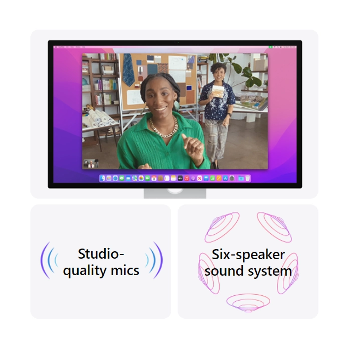 Introducing Studio Display. An immersive 27-inch 5K Retina display* with a 12MP camera with Center Stage, studio-quality mics, and six-speaker sound system. Pairs beautifully with any Mac.