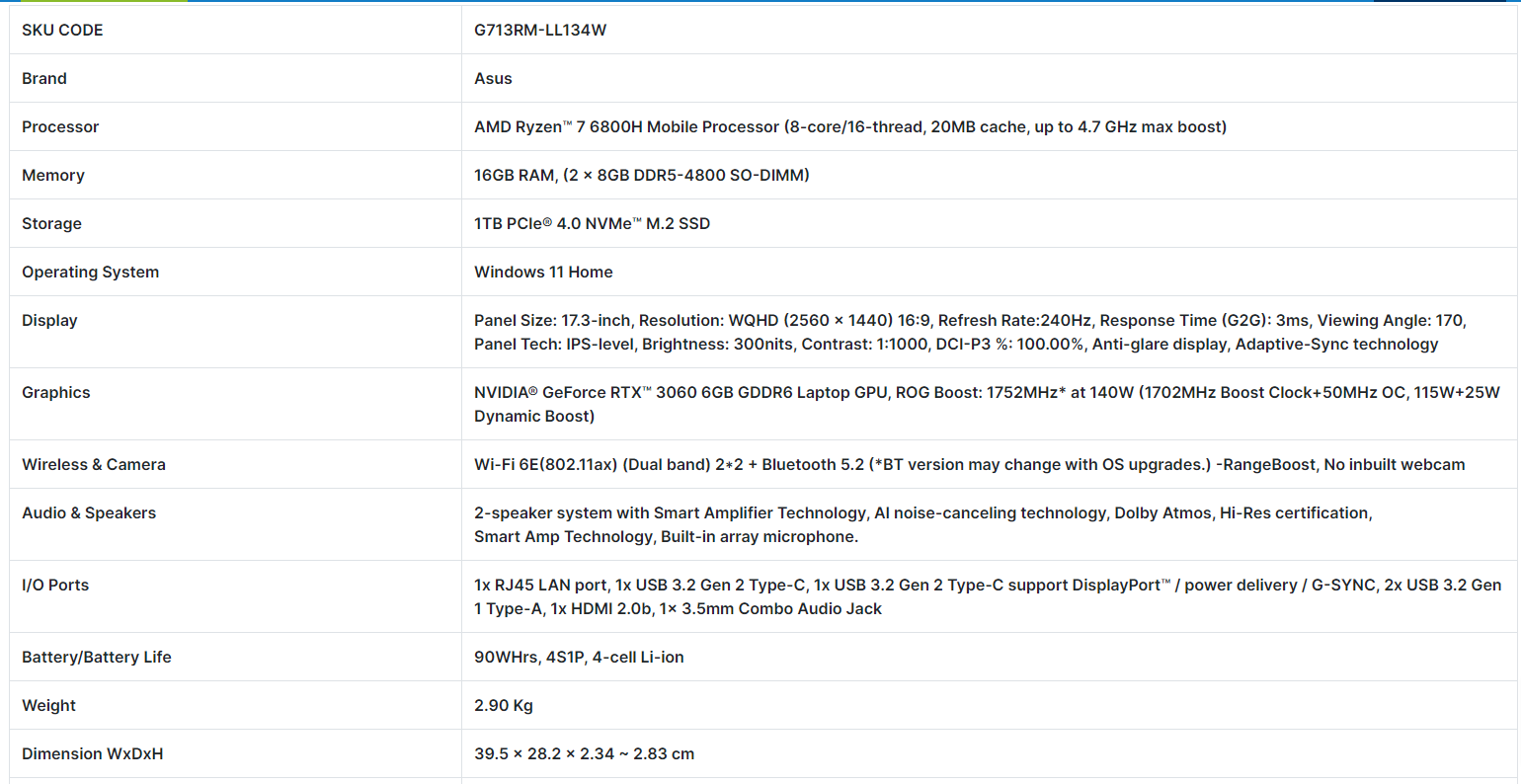 Product NameASUS G713RM R7-6800H/16/1SSD/6-3060/17.3" 240HZ/W11