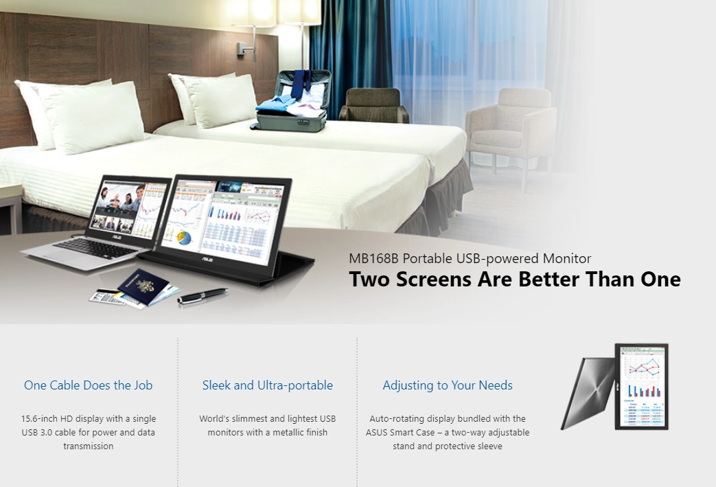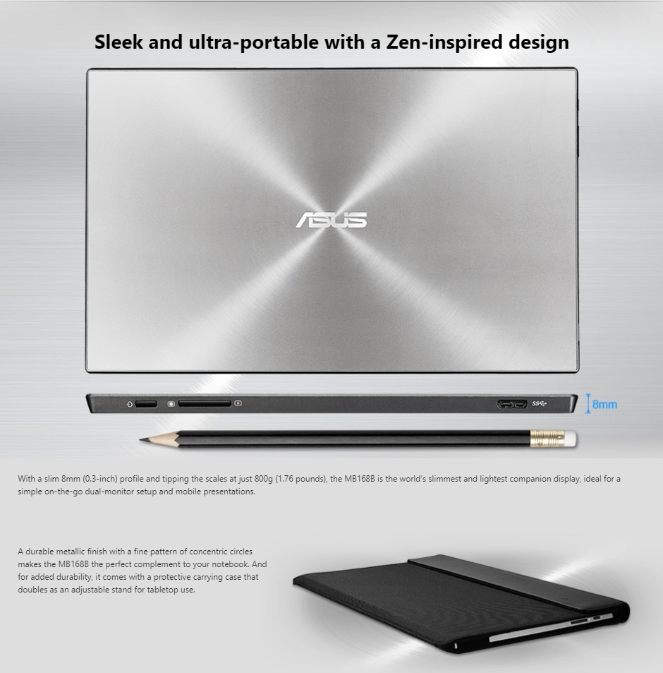 ASUS MB168B Portable USB Monitor - 16 inch (15.6 inch viewable), HD, USB-powered, Ultra-slim, Smart Case