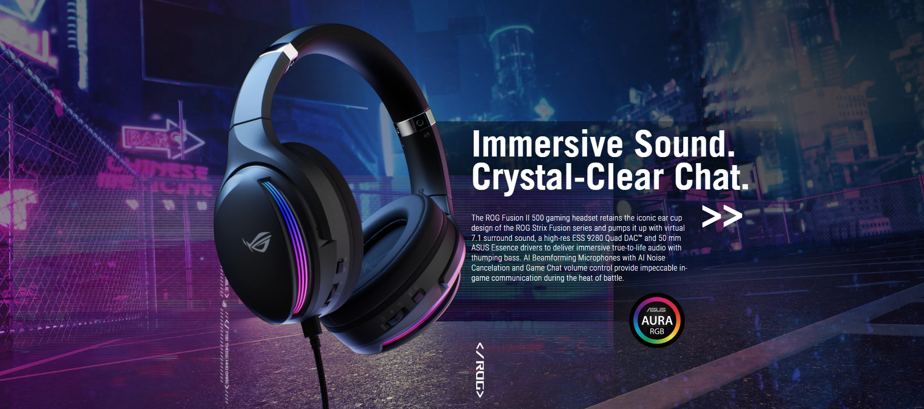 The ROG Fusion II 500 is designed for RPG and FPS games. It achieves an unprecedented 130 dB SNR ― a spec unattainable by single DAC headsets. Plus, its exclusive 50 mm ASUS Essence drivers and airtight chambers provide deep and powerful bass so you can precisely pinpoint the origin of gunfire or explosions on the battlefield and experience ultimate gaming immersion.