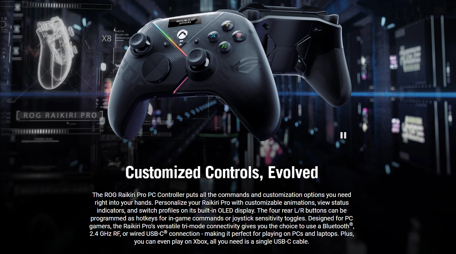 Get creative and show off your style by using Armoury Crate to flaunt a custom image, animation, or text on the ROG Raikiri Pro’s built-in OLED display. Use the OLED to switch connection modes, view controller profiles and change them on the fly, as well as monitor charging, power, or mic status. Use the two buttons above the OLED to select controller profiles or change what’s being displayed onscreen, even when you’re in the middle of a game.