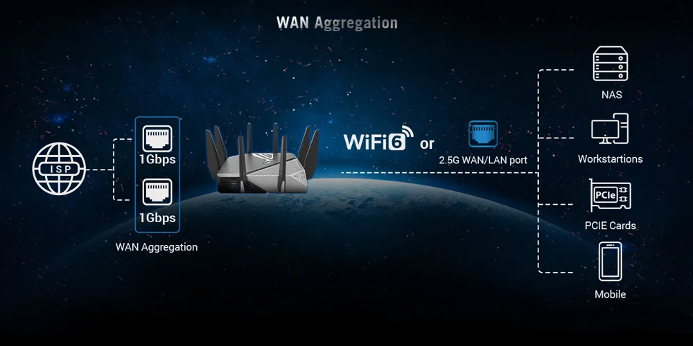ROG Rapture GT-AXE11000 provides you more option in connecting to your network. Depending on the ISP or different type of modem you’re using, you can choose between 2.5G WAN/LAN port or two 1Gbps to achieve the fastest WiFi experience possible.