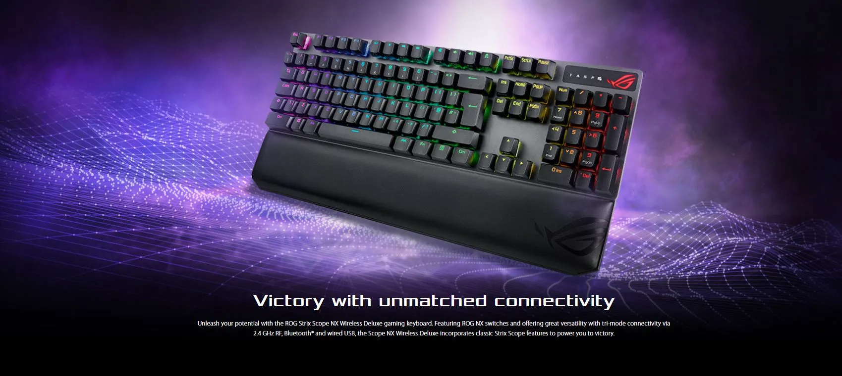 Unleash your potential with the ROG Strix Scope NX Wireless Deluxe gaming keyboard. Featuring ROG NX switches and offering great versatility with tri-mode connectivity via 2.4 GHz RF, Bluetooth® and wired USB, the Scope NX Wireless Deluxe incorporates classic Strix Scope features to power you to victory.