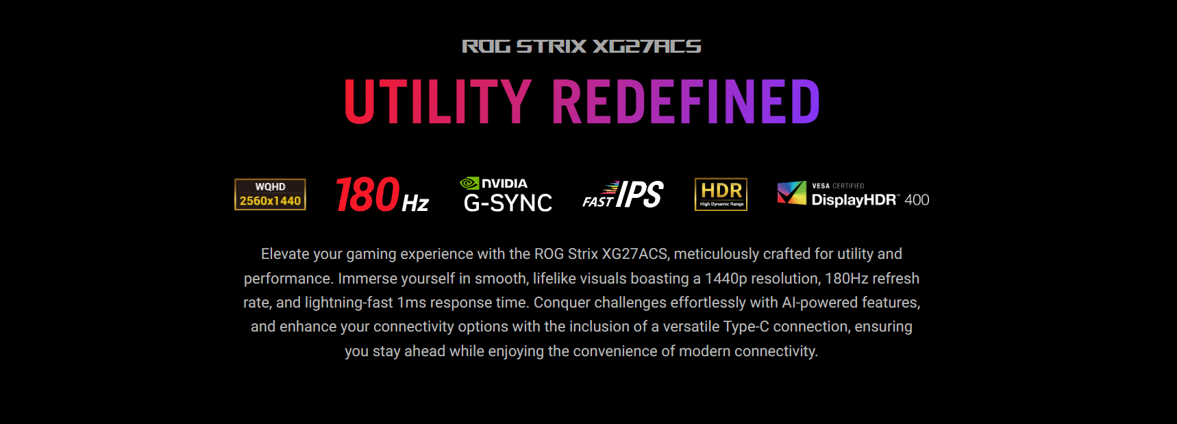 Immerse yourself in stunning visual precision with the ROG Strix XG27ACS. Its Fast IPS technology, coupled with a vivid 1440p resolution and Display HDR400 support, ensures an unparalleled gaming and multimedia experience, bringing every detail to life with vibrant colors and remarkable clarity.