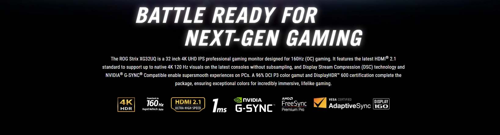 Asus ROG Strix XG32UQ 32" 4K UHD Fast IPS, 160Hz, 1ms, HDMI 2.1 - Black Battle Ready for Next-Gen Gaming The ROG Strix XG32UQ is a 32-inch 4K UHD IPS professional gaming monitor designed for 160Hz (OC) gaming. It features the latest HDMI® 2.1 standard to support up to native 4K 120 Hz visuals on the latest consoles without subsampling, and Display Stream Compression (DSC) technology and NVIDIA® G-SYNC® Compatible enable supersmooth experiences on PCs. A 96% DCI P3 color gamut and DisplayHDR™ 600 certification complete the package, ensuring exceptional colors for incredibly immersive, lifelike gaming. Next-Gen Gaming with HDMI 2.1 Native 4K @120Hz refresh rate on the latest consoles. HDMI 2.1 with full 48 Gbps bandwidth (Learn More) Variable Refresh Rate (VRR) Auto Low Latency Superfast 4k Gaming on Pc 4K @ 144 Hz on PCs with the latest graphics cards DSC technology supports 4K visuals via a single DisplayPort 1.4 connection. Ultrafast Refresh Rate and Response Time Complementing the lightning-fast 160 Hz refresh rate (OC), the Strix XG32UQ offers near instantaneous 1ms response time (GTG) for buttery smooth visuals without smearing and motion blur. Certified Nvidia G-Sync Compatible The Strix XG32UQ delivers a seamless, tear-free gaming experience by enabling variable refresh rate technology as a default on NVIDIA GeForce® graphics cards. HDR Amazing Cinema-Grade Colors HDR and quantum dot technologies enable the Strix XG32UQ to deliver a wider color range and higher contrast levels than traditional monitors, offering the brightest whites and darkest blacks. Asus Variable Overdrive The Strix XG32UQ includes six pre-set Variable Overdrive modes that dynamically adjust overdrive settings as frame rates fluctuate, eliminating ghosting for exceptionally smooth visuals. In-Game Enhancements GamePlus The ASUS-exclusive, integrated GamePlus hotkey offers in-game enhancements that help you get more out of the game. Co-developed with input from pro gamers, GamePlus functionality allows you to practice and improve gaming skills. GameVisual ASUS GameVisual technology has seven pre-set display modes to optimize visuals for different types of content. This unique feature can be easily accessed through a hotkey or the on-screen display settings menu. Reduces input lag, making it ideal for racing games when G-SYNC technology is on. Flicker-Free Technology Flicker-Free technology reduces flicker to minimize eyestrain for improved comfort when you're embroiled in long gaming sessions. Ultra-Low Blue Light Technology ASUS Ultra-Low Blue Light technology reduces the amount of potentially harmful blue light emitted by the display. Four different filter settings are available to control the amount of blue light reduction. Extensive Connectivity A multitude of connectivity options, including HDMI 2.1, USB 3.2, and DisplayPort 1.4 (DSC), ensures wide Compatible with a variety of input sources. Ergonomic Design Designed for your comfort, the stand offers tilt, swivel, and height adjustments to allow you to find the ideal viewing position. In addition, Strix XG32UQ is also VESA wall mount-compatible for more flexible placement options.