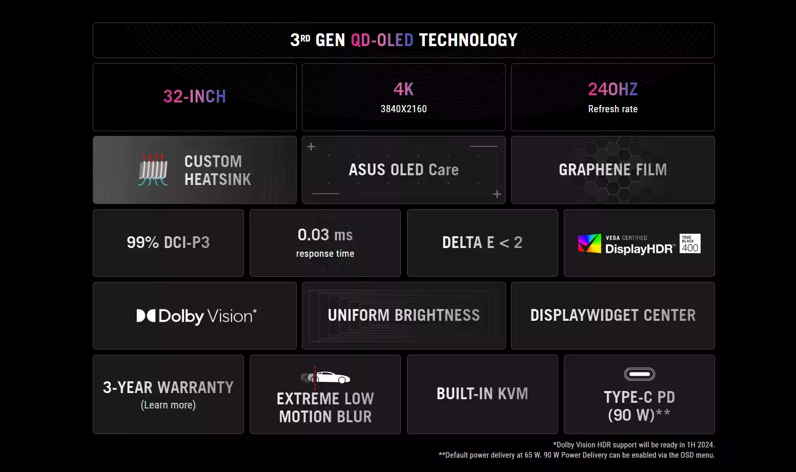 The ROG Swift OLED PG32UCDM boasts a 32-inch 4K QD-OLED panel that delivers astounding visuals at a buttery-smooth 240 Hz. Powered by third-generation QD-OLED technology, the PG32UCDM delivers vibrant colors, the deepest black hues, and the brightest highlights. Plus, the 0.03 ms response time ensures blur-free action, even in intense gameplay. Inside, an advanced custom heatsink offers exceptional cooling to reduce the likelihood of burn-in and improve performance and longevity of the OLED panel. This premium monitor is designed for gamers who demand the very best, offering an unbeatable combination of size, image quality, and refresh rate speed for exhilarating gaming experiences.