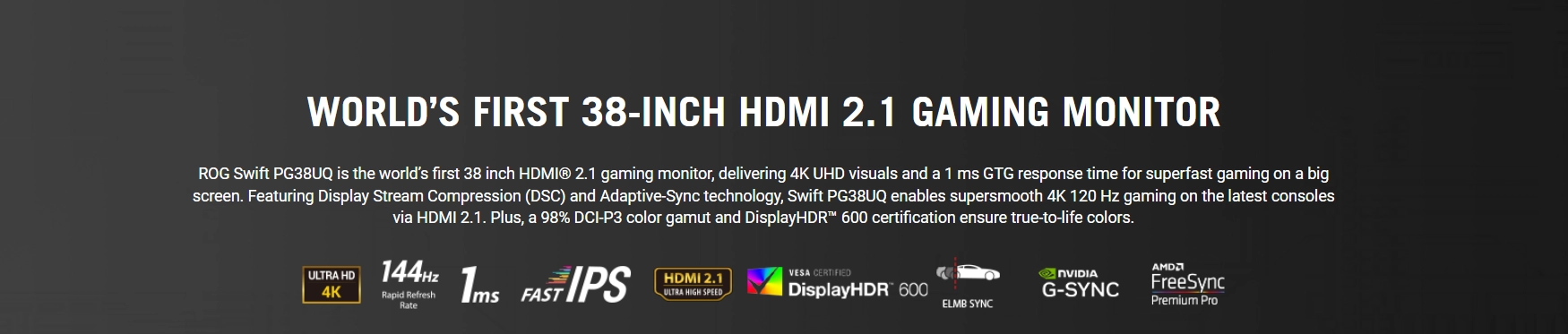 Product NameAsus Rog Swift Pg38uq 4k 144hz Gaming Monitor 38-inch 4k Uhd (3840 X 2160), 144hz, 1ms, Fast Ips