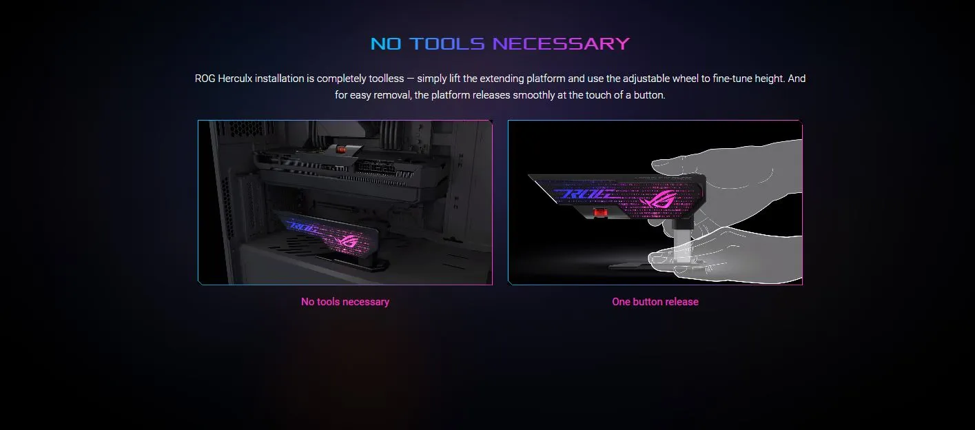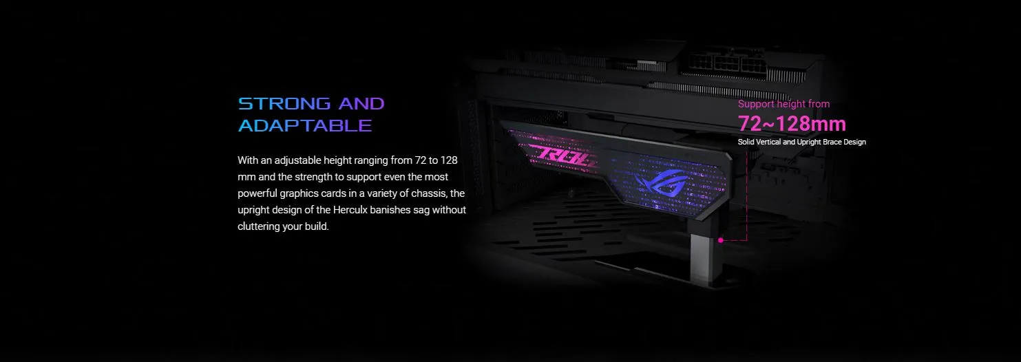 The ROG Herculx packs the structural integrity to bear the burden of even the heaviest graphics card. Toolless installation, precision adjustment, and customizable RGB lighting are combined into a space-saving design that neatly slides in to protect your investment in GPU horsepower.