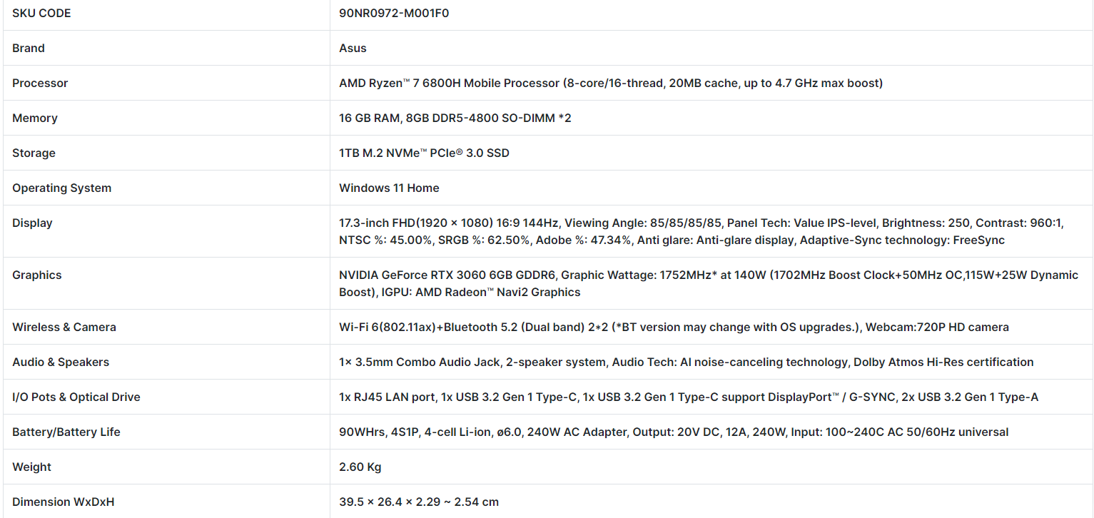 Product NameASUS TUF Gaming A17 AMD Ryzen™ 7 6800H Mobile Processor, 16GB RAM, 1TB SSD, NVIDIA GeForce RTX 3060 6GB GDDR6 Graphics, 17.3"FHD 144Hz Display, Windows11 Home, 1 Year Warranty