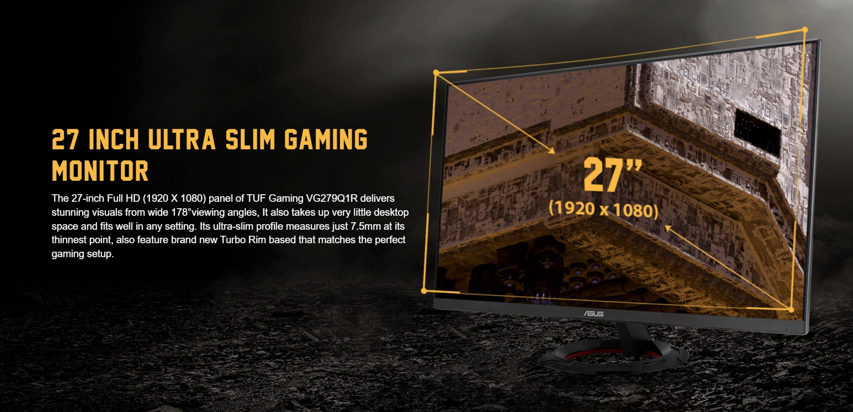 Asus TUF Gaming VG279Q1R 27" FHD IPS, 144Hz, 1ms, AMD FreeSync Premium Gaming Monitor - Black TUF GAMING VG279Q1R TUF Gaming VG279Q1R is a 27-inch, Full HD (1920x1080) display with an ultrafast 144Hz refresh rate designed for professional gamers and those seeking immersive gameplay. It also features Adaptive-Sync (FreeSync™) technology, for extremely fluid gameplay without tearing and stuttering. 27 Inch Ultra Slim Gaming Monitor The 27-inch Full HD (1920 X 1080) panel of TUF Gaming VG279Q1R delivers stunning visuals from wide 178°viewing angles, It also takes up very little desktop space and fits well in any setting. Its ultra-slim profile measures just 7.5mm at its thinnest point, also features brand new Turbo Rim based that matches the perfect gaming setup. 144hz Refresh Rate TUF Gaming VG279Q1R has a super-fast 144Hz refresh rate, ensuring that even fast-paced games played at the highest visual settings look battery smooth and completely lag-free. Get the upper hand in first person-shooters, racing, real-time strategy and sports titles. Extreme Low Motion Blur ASUS-exclusive Extreme Low Motion Blur technology achieves 1ms MPRT to eliminate smearing and motion blur. It also makes moving objects appear even sharper, so gameplay is more fluid and responsive. In−Game Enhancements Shadow Boost ASUS Shadow Boost technology clarifies dark areas of the game without overexposing brighter areas, improving overall viewing while also making it easier to spot enemies hidden in dark areas of the map. GAMEPLUS The ASUS-exclusive, integrated GamePlus hotkey offers in-game enhancements that help you get more out of your game. This function is co-developed with input from pro gamers, allowing them to practice and improve their gaming skills. GAMEVISUAL ASUS GameVisual Technology has seven pre-set display modes to optimize visuals for different types of content. This unique feature can be easily accessed through a hotkey or the on-screen display settings menu. Flicker-Free Technology Flicker-Free technology reduces flicker to minimize eyestrain for improved comfort when you're embroiled in long gaming sessions. Ultra-Low Blue Light Technology ASUS Ultra-Low Blue Light technology reduces the amount of potentially harmful blue light emitted by the display. Four different filter settings are available to control the amount of blue light reduction. Engineering Rich Connectivity Extensive connectivity options, including, DisplayPort1.2, HDMI (v1.4)x2, Earphone Jack support a wide array of multimedia devices.
