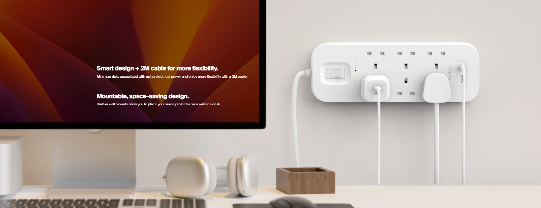 Mountable, space-saving design. Built-in wall mounts allow you to place your surge protector on a wall or a desk.