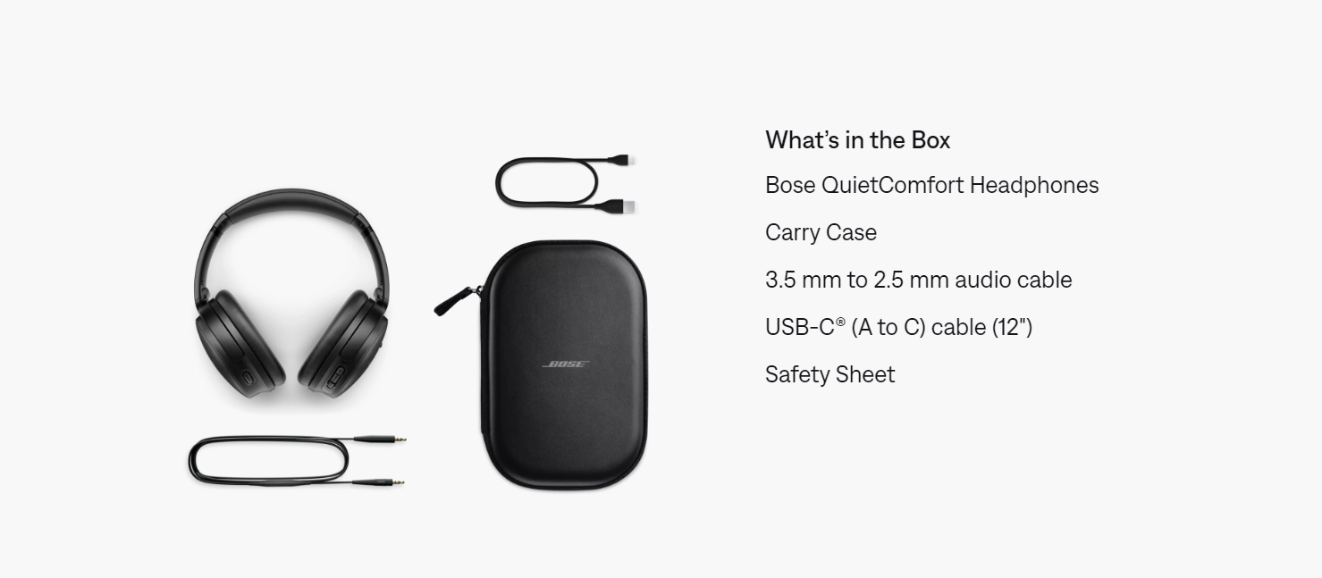 Headphone Fit: Around Ear Circumaural Headband: On Head Cushions: Removable Cushion Microphones: Built-in Microphone Noise Cancelling: Yes Noise Control Type: Active Noise Cancelling Audio cable included: Yes Case: Carry, Storage Headphone: 7.68" H x 6.18" W x 3.15" D (0.52 lb) Product Material: Metal, Plastic, Leather (Protein) Product Case Material: Leather (Hard) Ear Cushion Material: Protein Leather Rechargeable: Yes Battery Life: 24 hours Battery Charge Time: 2.5 hours Charging Accessory included: Yes Charging Interface(s:) USB Wireless Connectivity: Bluetooth Bluetooth Version: 5.1 Bose App: Bose Music App