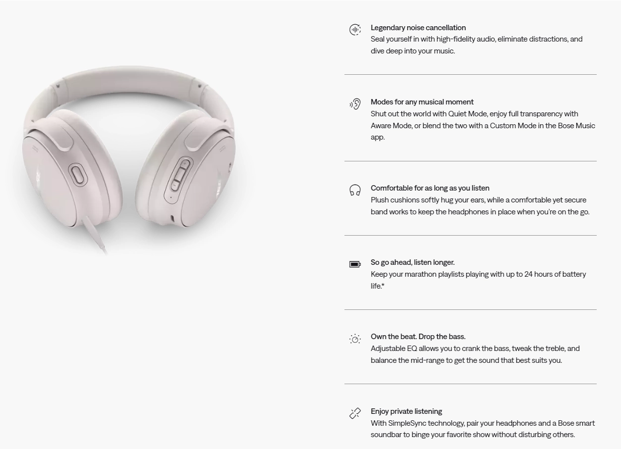 Take charge of your music and stride along to the beat. High-fidelity audio and legendary noise cancellation work their magic by sealing you in, eliminating distractions, and letting you dive deep into your own rhythm. Toggle between Quiet and Aware Modes, or create a Custom Mode and adjust outside sound to the moment. The design is iconic and the comfort lasting, while an optional audio cable with an in-line microphone plugs you into sound as bold as you, even without a Bluetooth® connection.