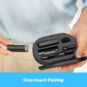 Place the transmitter and receiver in the charging case and close the cover. Open the cover again and they are both automatically powered and paired for immediate use without any setup required.