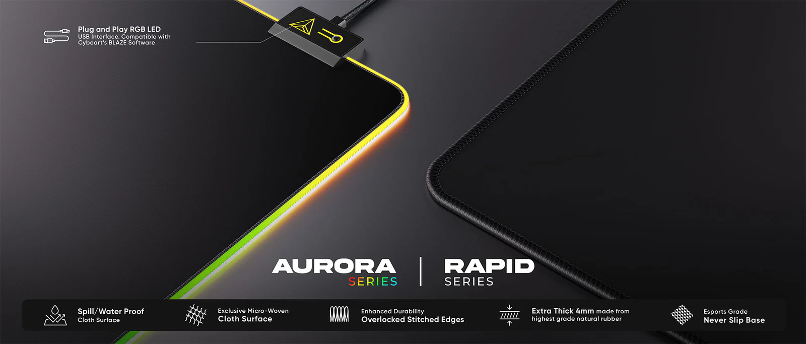 Premium RGB LED lighting. Controllable with Cybeart's BLAZE software. (Aurora Series mousepads only)