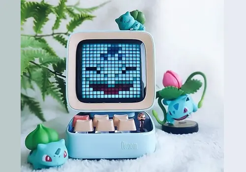 It’s the most visually pleasing, funnest, and feature-packed cute Bluetooth speaker you can get. The keys on this model are unique in that it uses backlit mechanical keyswitches on mini keyboard and the bright colors on the 16 x 16 pixel "monitor" which adds to the theme of retro arcade style.