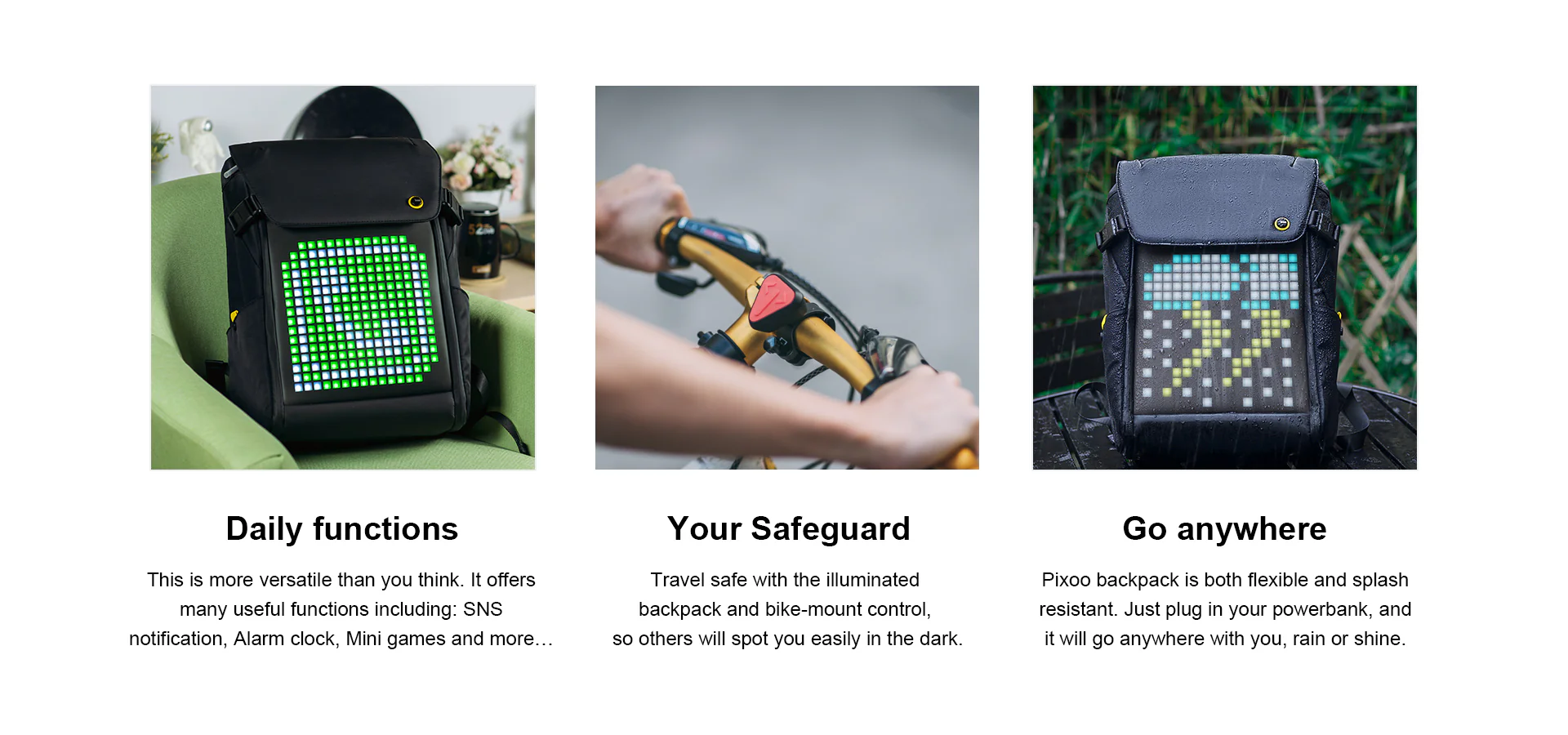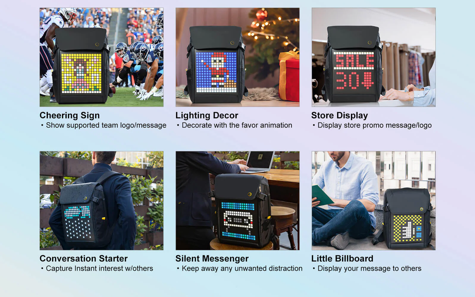 Pixel Art Display DIY & display your pixel animation, or search one from its massive in-app online gallery. This backpack helps you to stay in the spotlight!