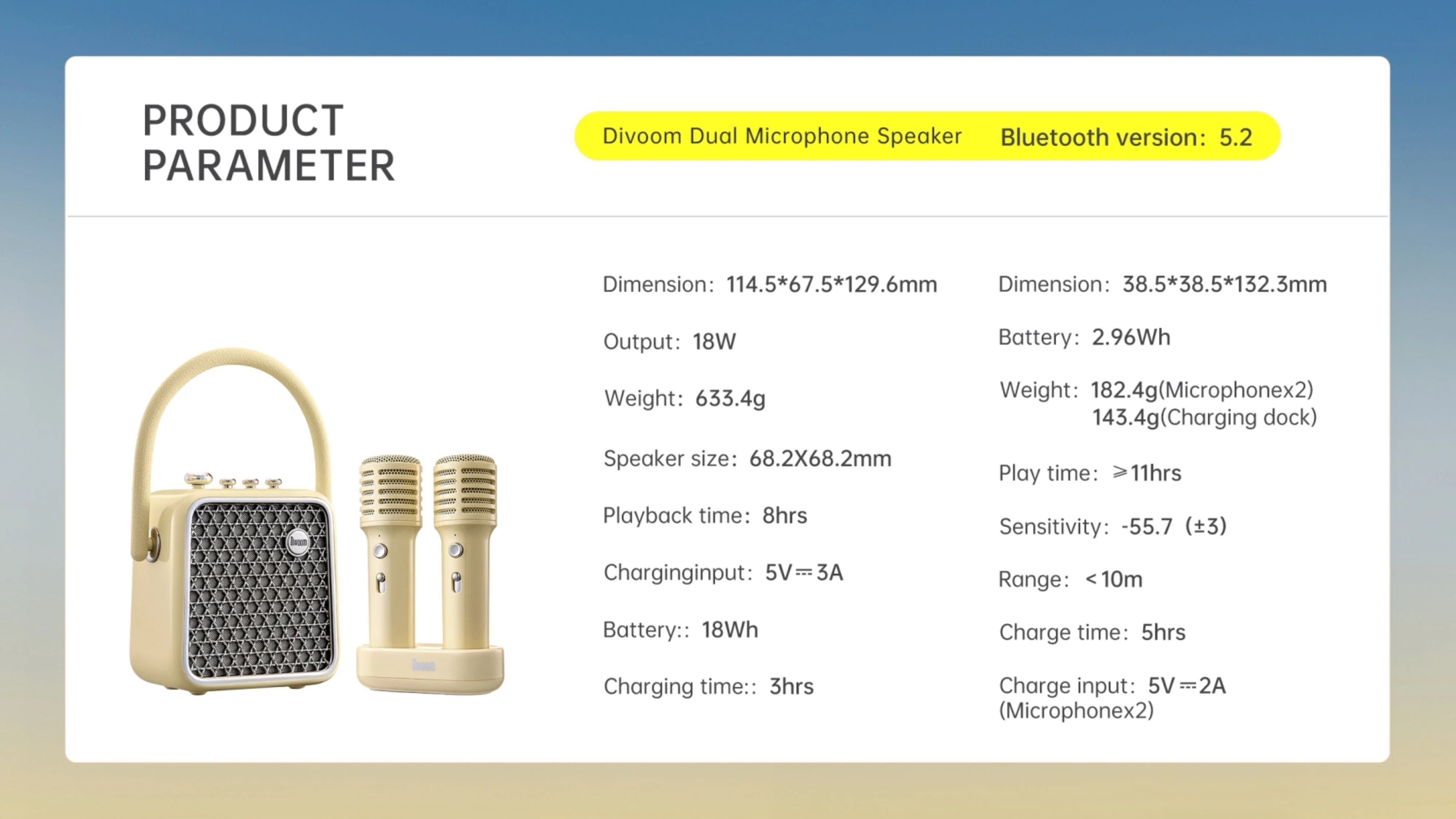 Wave good-bye to traditional microphone and KTV, say hello to the new combination of speaker and 2 microphones, start singing duo anywhere anytime.