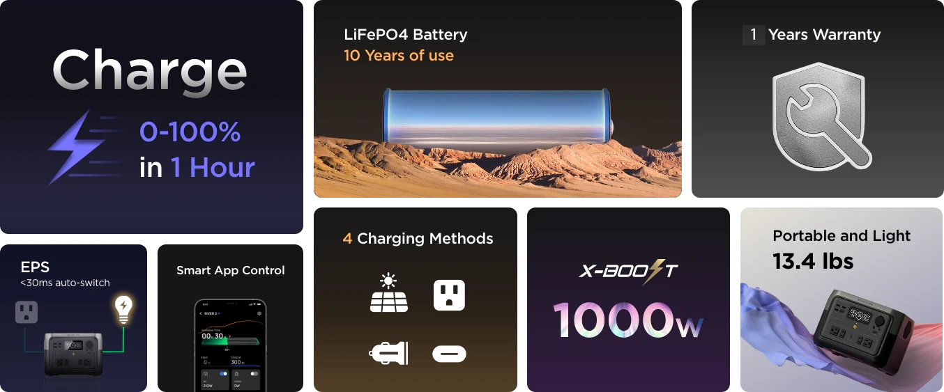 LiFePO4 Battery Chemistry Safe, for up to 10 years of use. With upgraded long-lasting LFP battery chemistry at its core, charge and empty RIVER 2 Series over 3000 times. That's pretty much 10 years of everyday use1 and 6x longer than the industry average. With LFP cells, RIVER 2 Series is safe, durable, and highly efficient, even in warm temperatures.