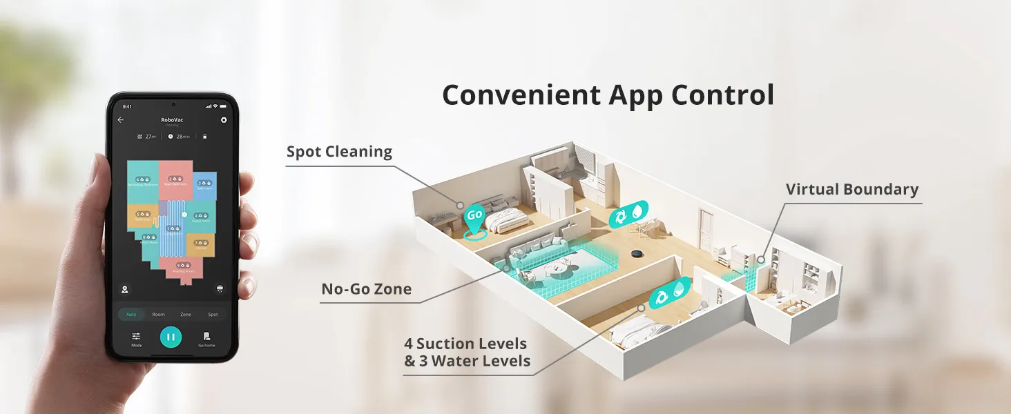 RoboVac’s 200 ml electronic water tank can be conveniently controlled via the app to allow you to switch between 3 water flow levels when cleaning different floor types.