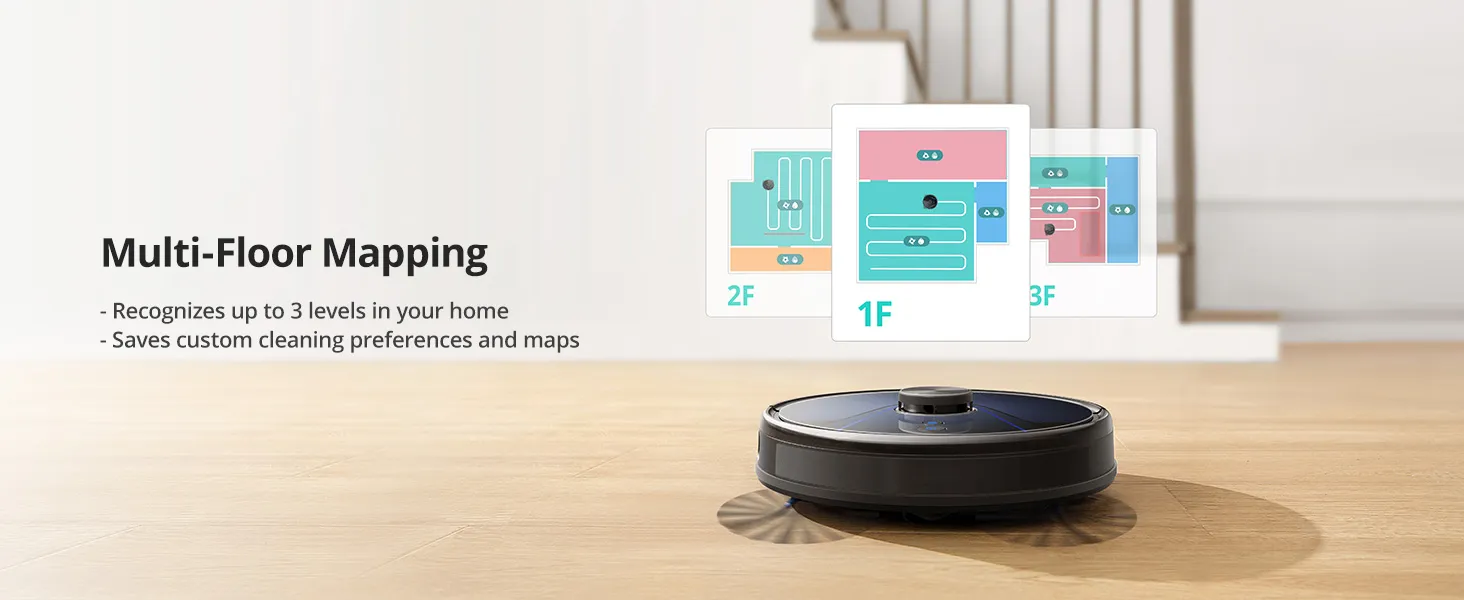 RoboVac can create maps for up to 3 levels in your home. It will also automatically recognize the floor it’s on once you set it down. The saved map includes both room layouts and custom preferences such as No-Go Zones.