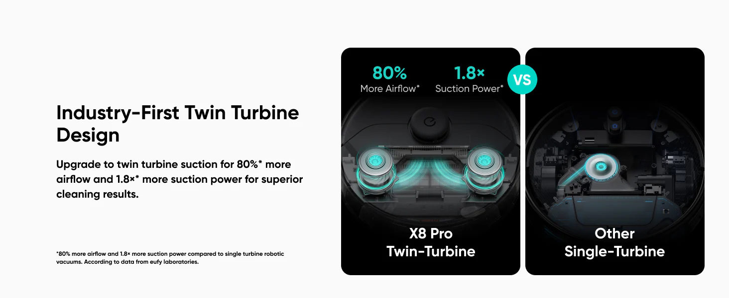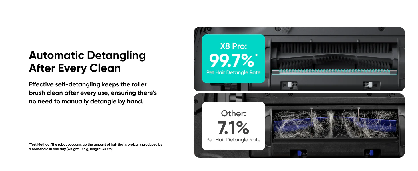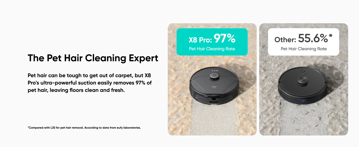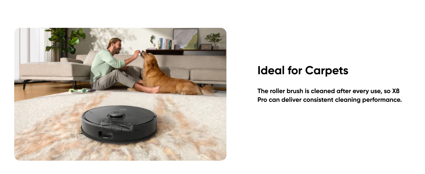 Hair-Free Cleaning: X8 Pro's powerful 2× 4,000 Pa Twin-Turbine™ suction easily removes pet hair from deep within carpets, leaving them clean and hair-free.