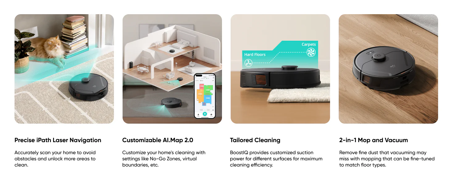 Precise iPath™ Laser Navigation: With precise maps of your home, effectively track cleaning routes, avoid obstacles, and unlock a wider range of areas to clean.