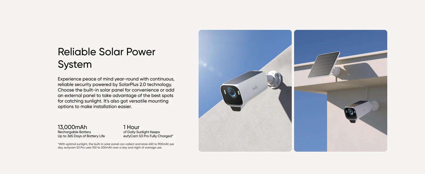 • Reliable Solar Power System: Experience peace of mind year-round with continuous, reliable security powered by SolarPlus 2.0 technology. Choose the built-in panel for streamlined efficiency or add an external panel to expand energy coverage. This system offers versatile mounting options and reliable backup power for continuous security.(includes backup solar panel).