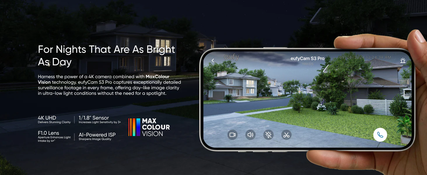 • Nighttime That's as Bright as Day:  Harness the power of a 4K camera combined with MaxColor Vision technology. eufyCam S3 Pro captures exceptionally detailed surveillance footage in every frame, offering day-like image clarity even in ultra-low light conditions without the need for a spotlight.