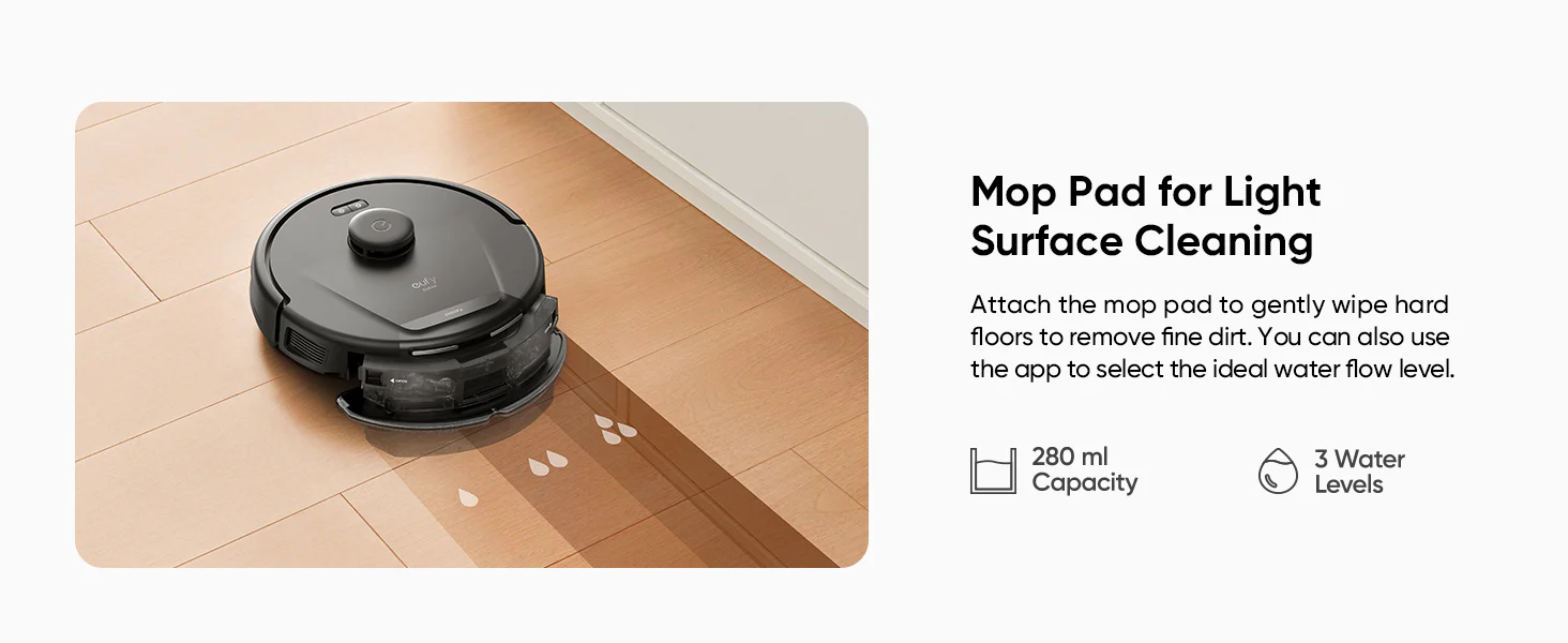 Mop Pad for Light Surface Cleaning: Attach the mop pad to gently wipe hard floors to remove fine dirt. You can also use the app to select the ideal water flow level.