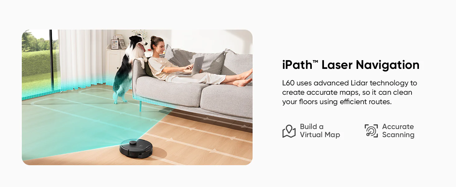 Precision Mapping for Efficient Navigation: iPath Laser Navigation uses advanced Lidar technology to scan rooms and create accurate maps for efficient cleaning routes around your home.