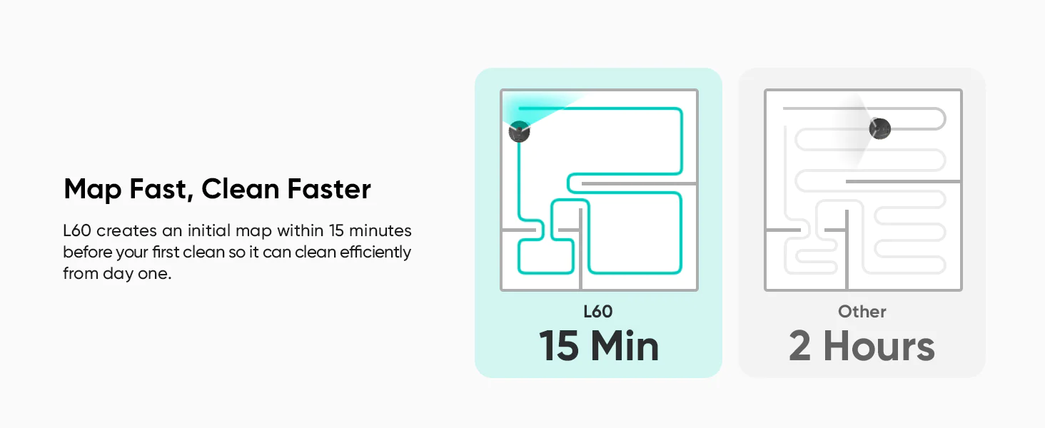 BoostIQ Technology: Different surfaces require different amounts of suction power for maximum cleaning efficiency, so L60 automatically increases suction when needed.