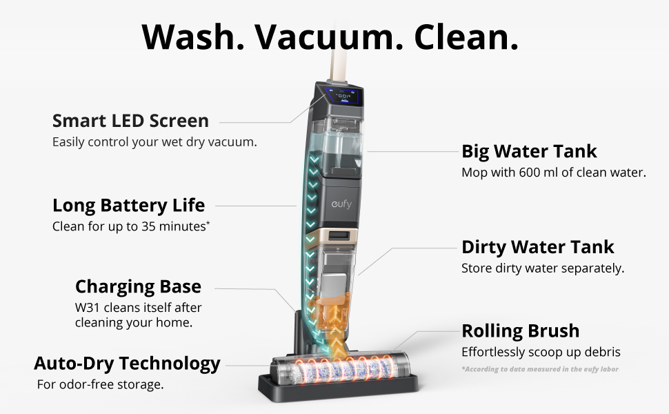 Lasting up to 35 minutes*, you can thoroughly clean up wet and dry messes uninterrupted. *According to data measured in the eufy laboratory.