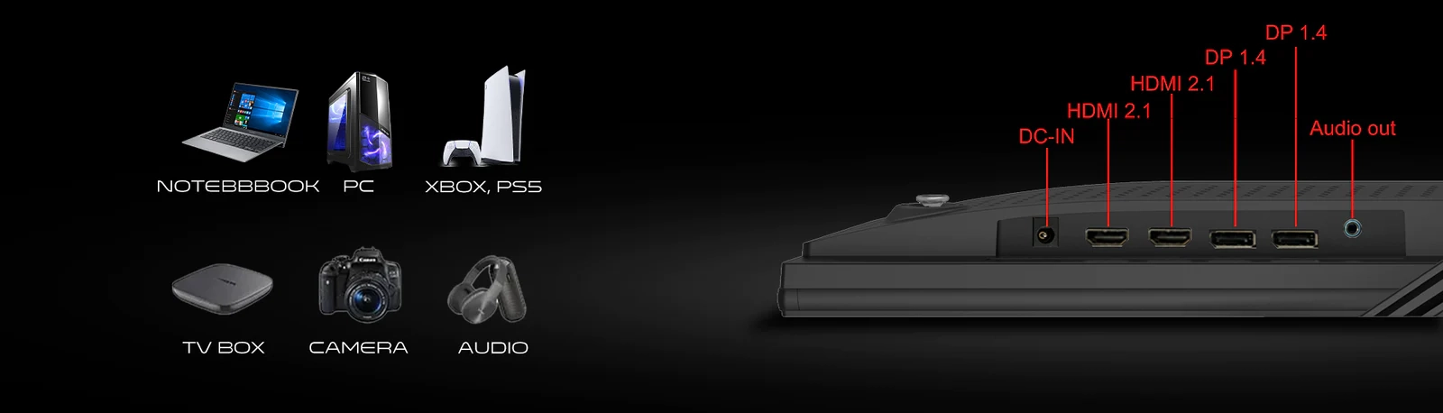 Multiple connectivity options including DisplayPort (DP1.4) and HDMI2.1 ports.