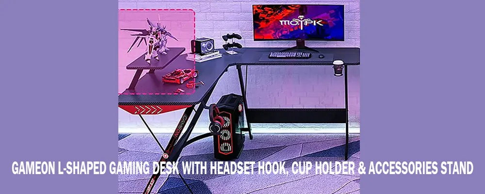 GAMEON L-Shaped Slayer I Series Gaming Desk (Size: 129*129*74cm & Table top 80*46cm) With Headset Hook, Cup Holder & Accessories Stand - Black