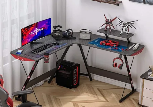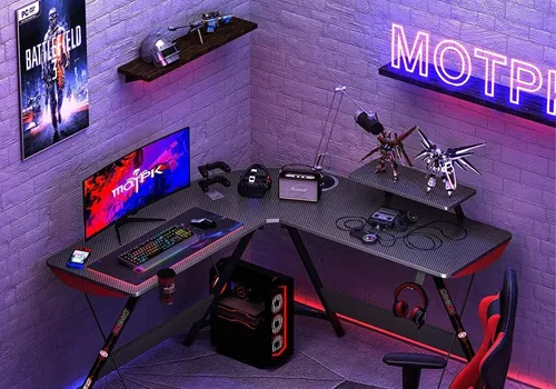 The L shaped structure designed to fully utilize your home/office space, the desk snuggles into a corner space, filling the edges of the area against the wall, creating more floor space in the room. This desk also comes with a detachable & switchable monitor riser stand, offering you more space for storage and gaming activities.
