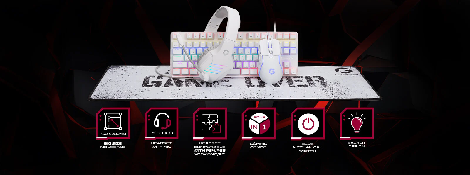 Gameon Viper Xa All-in-one Artic Series Gaming Bundle (Mechanical Keyboard, Headset, Mouse & Mousepad) best price from Alfuhod Shop online Gameon Viper Xa All-in-one Artic Series Gaming Bundle (Mechanical Keyboard, Headset, Mouse & Mousepad) and free same day delivery from Alfuhod in Kuwait.