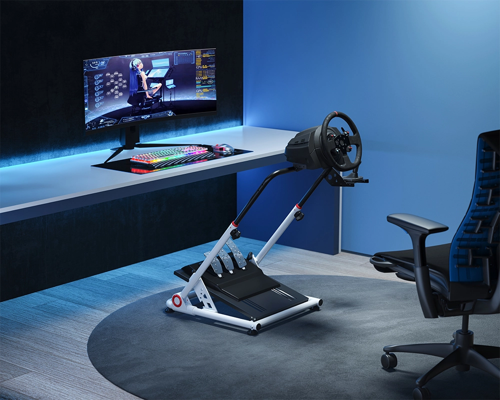 Racing Simulator Wheel Stand is one of the most portable racing simulator peripherals with the endurance of "aggressive driving" during fiercely competitive racing games, fitting almost anywhere between a screen and a chair/couch. The folding design allows gamers to stow the steering wheel stand easily by leaning the folded stand against the wall. In addition, the fully-adjustable design personalizes an optimized racing experience, creating a lifelike racing seat.