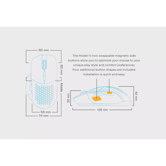 Our most feature-rich lightweight mouse yet. 9 Programmable buttons with 2 customizable magnetic thumb buttons put you in control. Looking at the highly-comfortable ergonomic shape, it's hard to believe the Model I is only 69 g.
