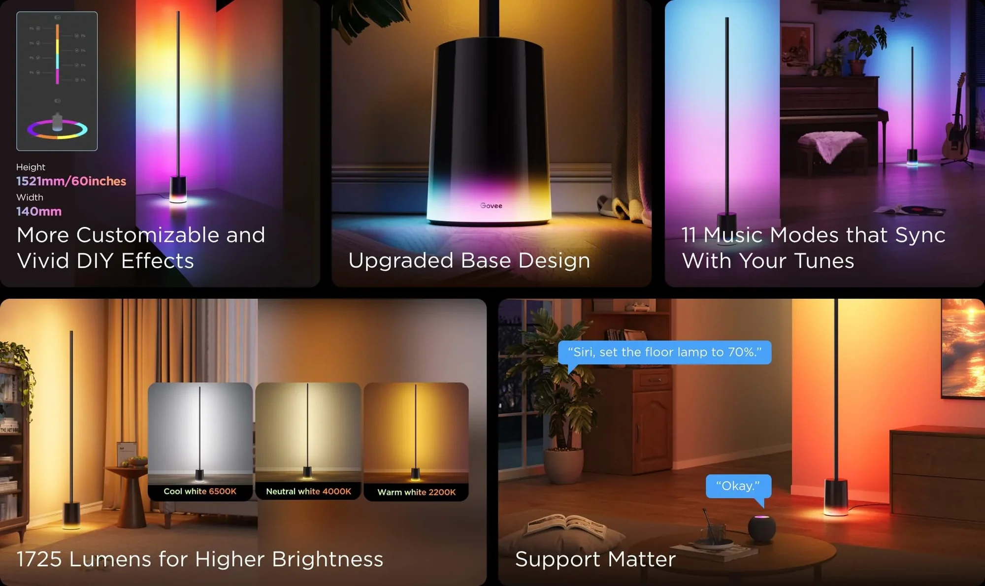 RGBICWW Technology and Brightness: Enjoy multi-color displays, 1725lm brightness (higher than previous models), and adjustable 2200k-6500k warm/cool whites. This RGBIC floor lamp caters to diverse daily lighting needs like reading, working and relaxing.