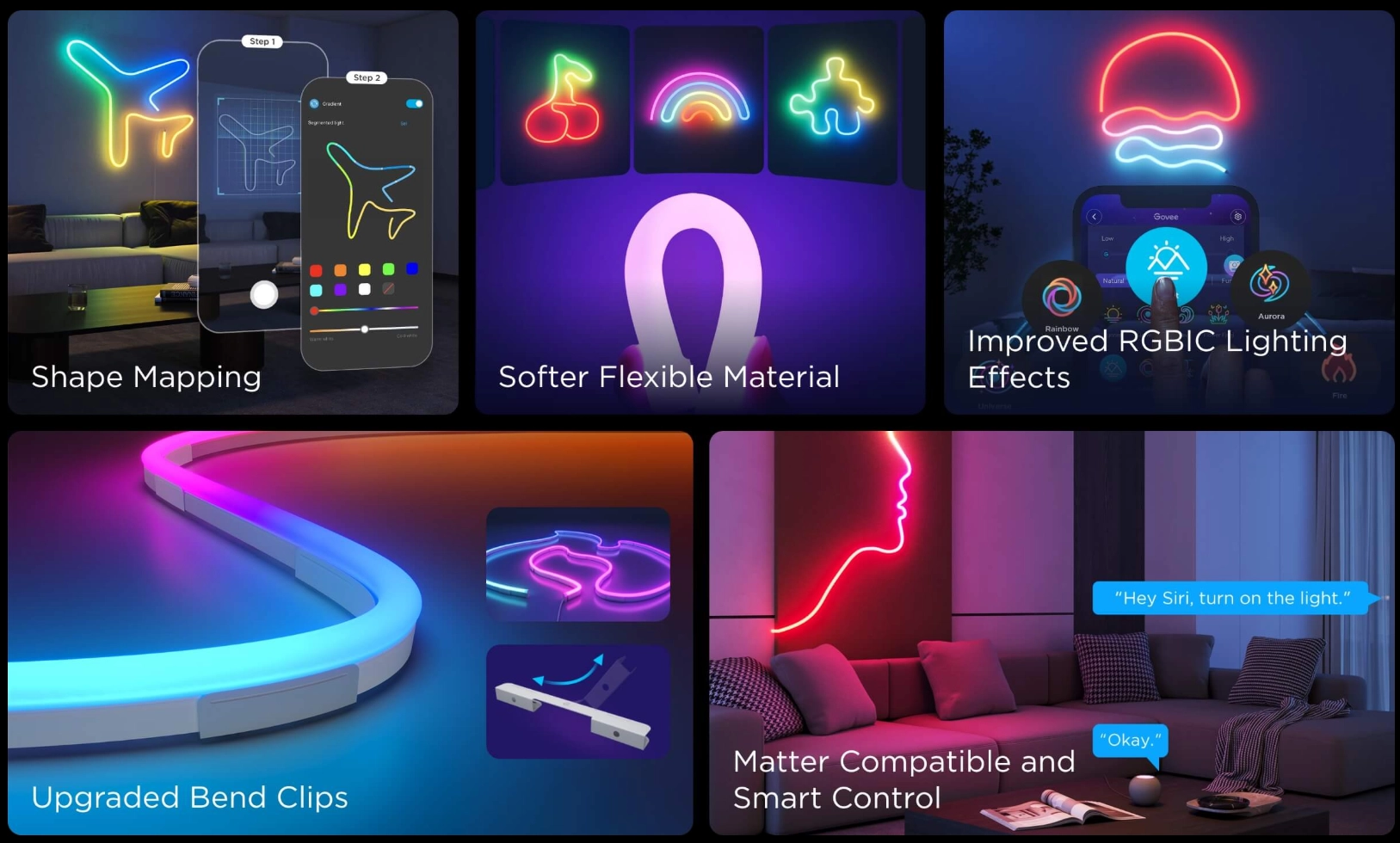 Add vibrant, flexible lighting to your space with the Govee Neon Rope Light 2. Measuring 3 meters in length, this RGBIC rope light features 252 individual light sources and is designed with upgraded bend clips and a softer material, allowing for more creative and precise installations. With 64 dynamic scene modes and 12 music-responsive effects, it transforms any room into a lively, immersive environment. Enjoy full control through the Govee app, voice assistants, or smart home integration with Matter.