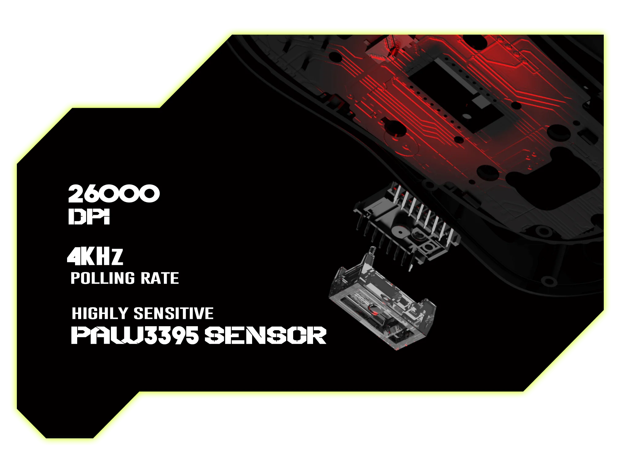 Dominate the gaming world with a up to 4K polling rate and a staggering 26,000 DPI sensor. PAW3395 provides ultra-smooth cursor movement and pinpoint accuracy, giving you the unseen advantage in every skirmish, every battle.