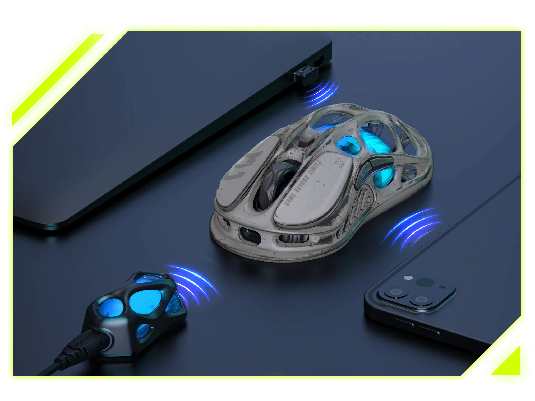 With the TURBOSPEED Wireless technology, the M1 Pro offers versatile connection options - from the ultra-fast 2.4G to the agile Bluetooth, down to the steadfast wired connection. Coupled with prolonged battery life, this mouse ensures you're always ready, always dominant. (M1 Pro Battle-Worn Silver Mist comes with 4K receiver)