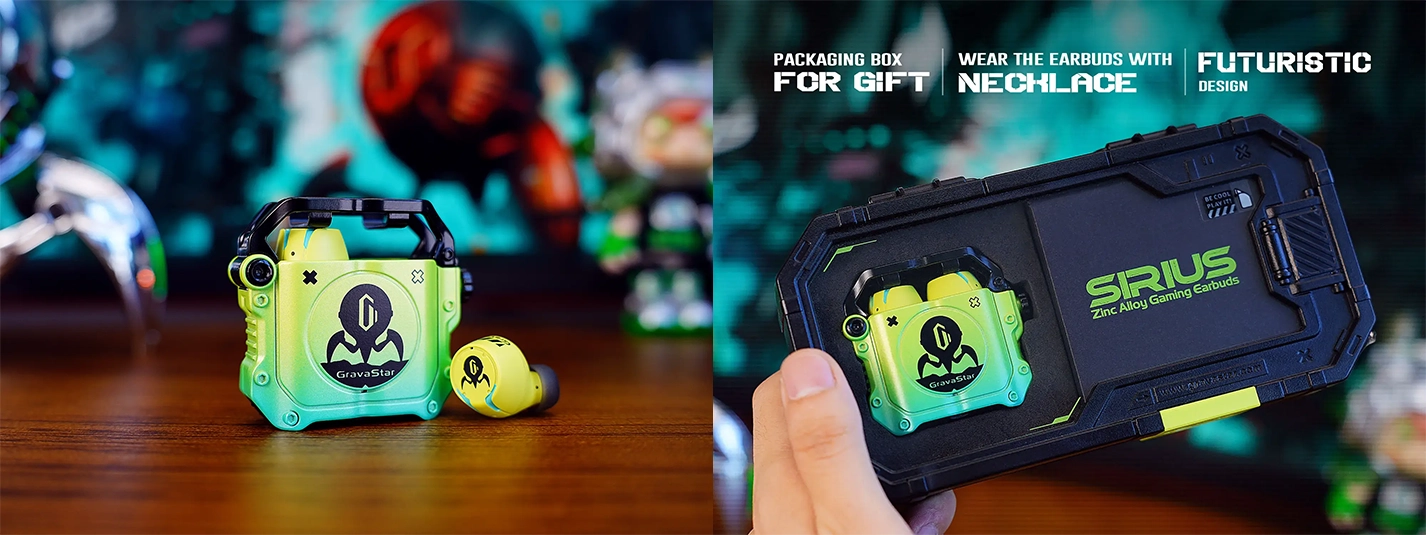 The charging case is made from a zinc alloy material that keeps it safe from scratches and bumps. It also features a physical button and a laser-engraved touch panel that gives it a vibe that’s out of this world.