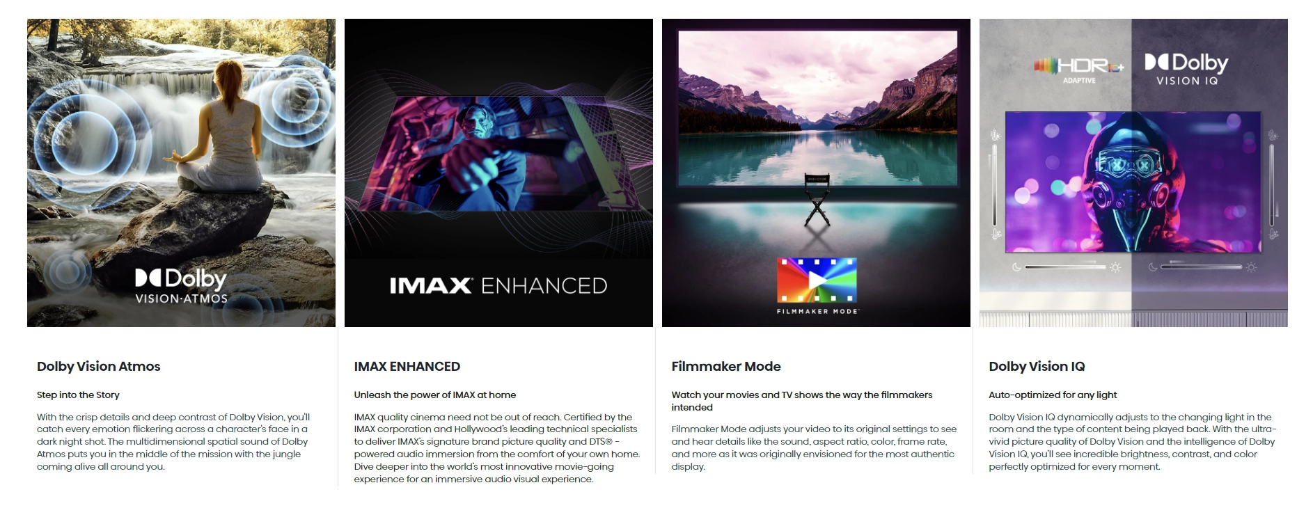 FilmMaker Mode: By disabling all post-processing (e.g. motion smoothing) and preserving the correct aspect ratios, colors and frame rates, Filmmaker Mode enables your TV to display the movie or television show’s content precisely as it was intended by the filmmaker.