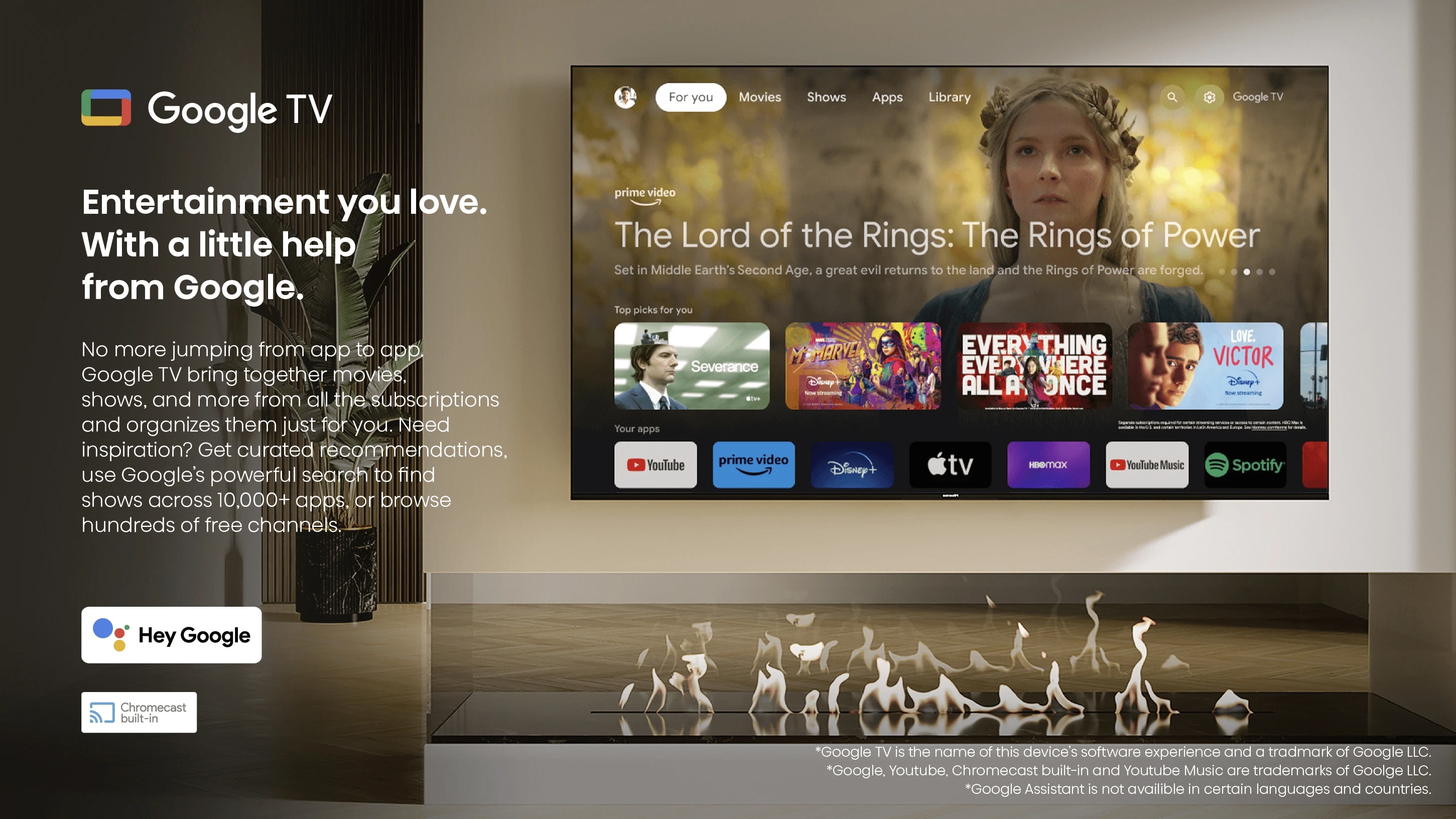 Google Assistant: The Google Assistant* is built into Google TV. Tell it to turn on the lights, change the thermostat, add stuff to your grocery list, or just play that video of your friend falling over for the millionth time. And with universal search, you can even get recommendations with Google TV.