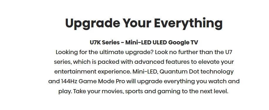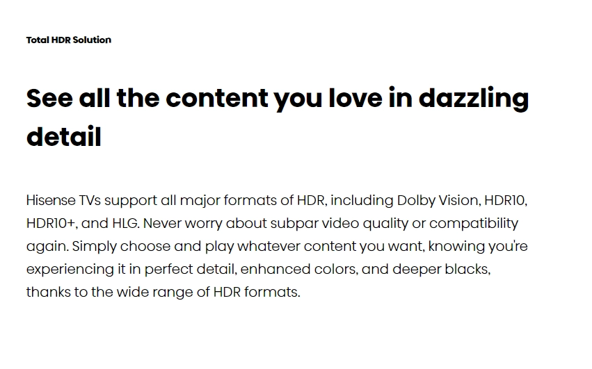 ULED4K: Hisense’s proprietary ULED technologies boost color, contrast, brightness, and motion. This suite of patented hardware and software technologies delivers an engaging and completely unique picture that can only be delivered by Hisense.
